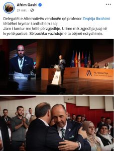 Ish-kryetari i Alternativws, tani kryetar i Kuvendit tw RMV-sw, Afrim Gashi, ka uruar Zeqirija Ibrahimin për zgjedhjen në postin e të parrit të partisë.