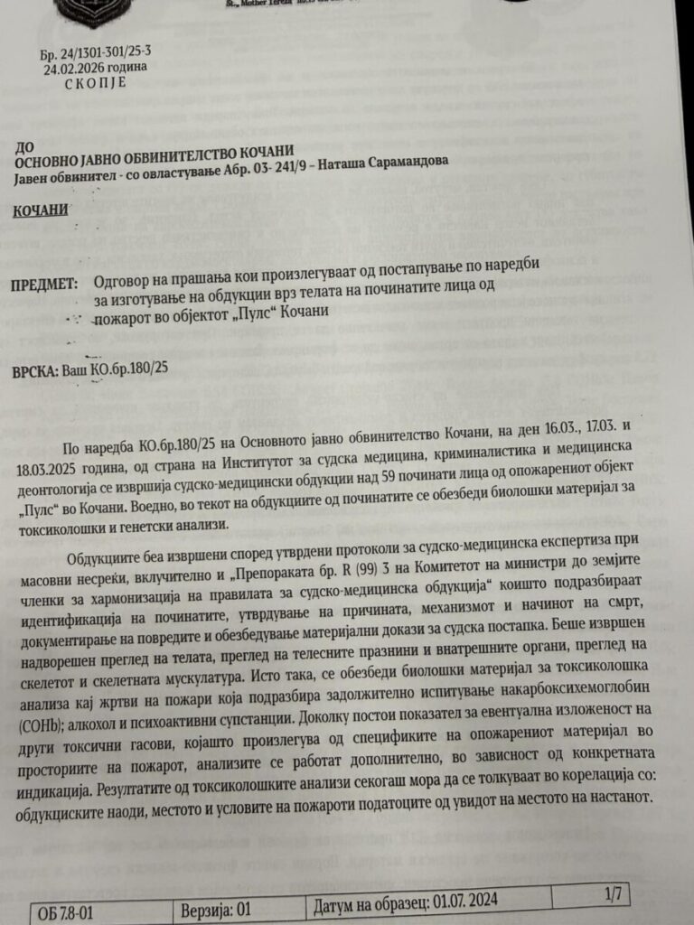Në bazë të analizave të kryera të gjakut të marra gjatë autopsisë së viktimave në zjarrin në diskotekën “Puls” në Koçan, ekspertiza nga Instituti i Mjekësisë Ligjore, sipas dokumentit zyrtarë, tregon se te 48 persona tashmë të ndjerë është zbuluar nivel i karboksihemoglobinës në gjakun e viktimave ku varionte nga 4,5% deri në 43.7% me çka konfirmon ekspozim të lartë ndaj monksid karbonit gjatë zjarrit. Tutje në theksohet se te 48 viktima gjatë analizave të bëra është konstatuar prania e alkoolit etilik në gjak si dhe substanca psikoaktive si kokaina, amfetamina dhe kanabisi.