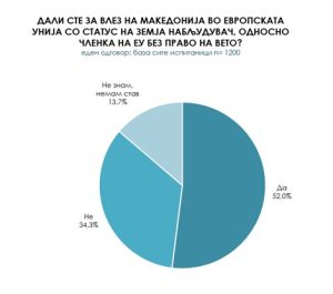 Në pyetjen nëse janë për hyrjen e Maqedonisë në BE me status të vendit vëzhgues, përkatësisht anëtare e BE-së pa të drejtë vetoje, më shumë se gjysma (52%) e të anketuarve janë shprehur se janë pro hyrjes së Maqedonisë në BE pa të drejtë vetoje