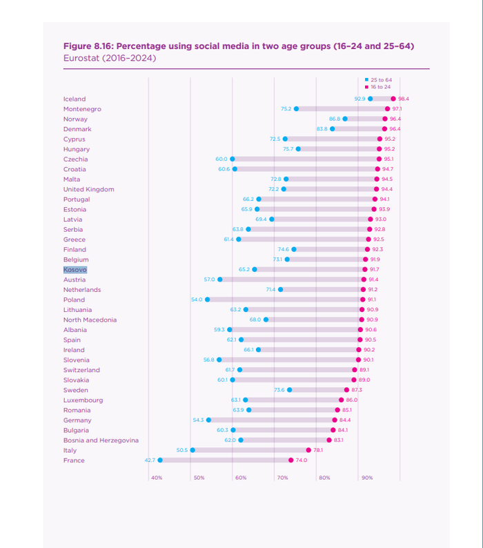 Sipas të dhënave të Eurostat, përdorimi i rrjeteve sociale është shumë i lartë – mbi 90% tek të rinjtë. Kjo e bën vendin shumë aktiv në hapësirën digjitale, por njëkohësisht hap debat nëse ky përdorim po përkthehet në mirëqenie më të madhe për qytetarët.