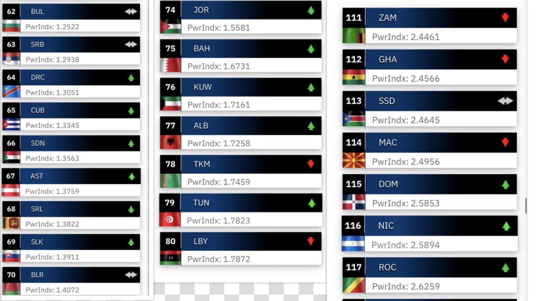• Shqipëria renditet në vendin 77, me trend rritës, dhe indeks fuqie PwrIndx 1.7258.