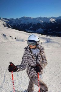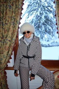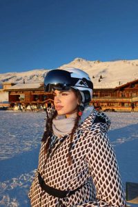 Donna Dafi është e veshur me një kostum bardhezi, kapelë dhe syze skijimi.