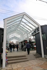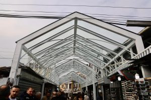 Ky konstruksion modern, i realizuar me çelik dhe xham, shërben si një hyrje funksionale dhe estetike, duke krijuar një lidhje organike mes dy hapësirave tregtare më të rëndësishme të qytetit. Përveç mbrojtjes ndaj kushteve atmosferike, ky investim pasuron karakterin urban të Çarshisë dhe ruan frymën e një pazari të gjallë e dinamik.