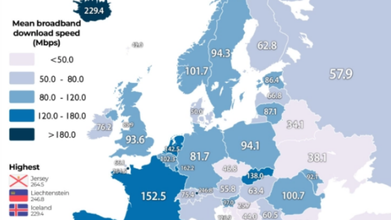 Interneti më i shpejtë në Evropë është në ishullin Jersey (264 Mbps) i vendosur midis Britanisë së Madhe dhe Francës, në Lihtenshtajn 246.8 Mbps dhe në Islandë 229.4 Mbps.