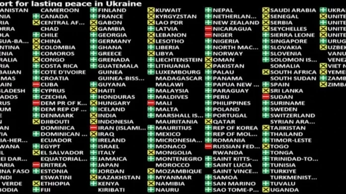 Presidenti ukrainas Volodymyr Zelensky shprehu mirënjohjen e tij për 107 vendet që mbështetën Ukrainën në Kombet e Bashkuara në mbrojtje të jetës në rrjetin social “X”, dhe gjithashtu bashkëngjiti një fotografi të tabelës që tregon se cili vend votoi.