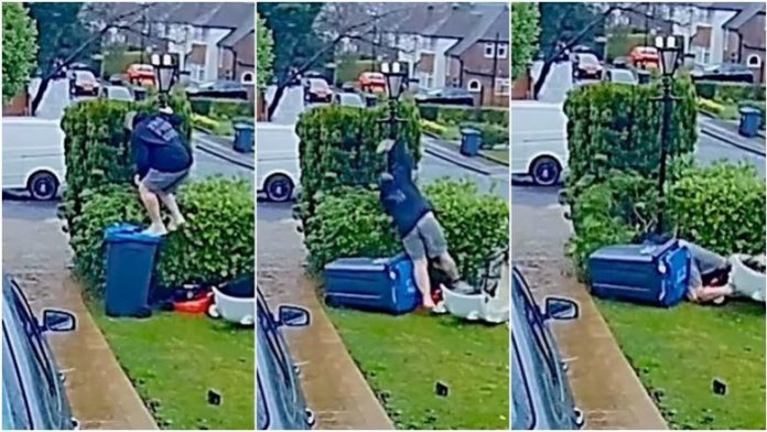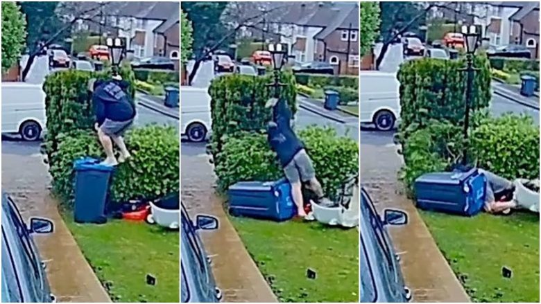 Ky është momenti qesharak kur një baba i dy fëmijëve përplaset me shkurre pasi kishte tentuar të hipte në majë të një koshi plehrash.