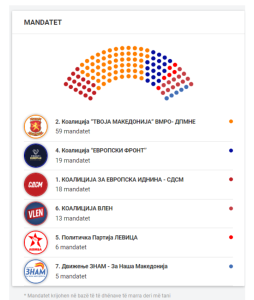 Prej tyre partia që më shumë ka marrë vota dhe mandate është VMRO-DPMNE-ja, e cila ka siguruar 406.239 vota ose 59 mandate.