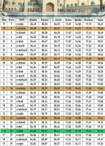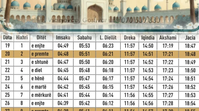 Tabela e publikuar më poshtë paraqet oraret e sakta të syfyrit dhe iftarit për secilën ditë të Ramazanit, sipas vaktisë zyrtare që vlen për territorin e Maqedonisë së Veriut.