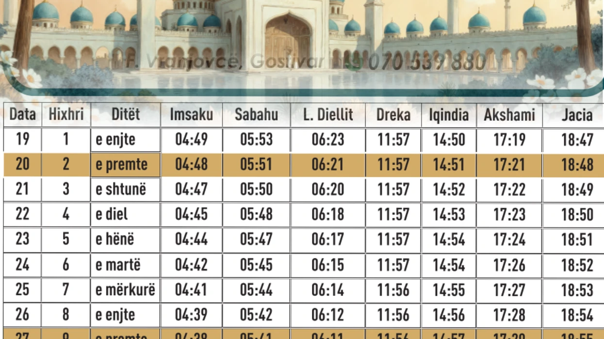 Imsakija e Ramazanit 2026 në Maqedoninë e Veriut është publikuar dhe përfshin oraret e sakta të syfyrit, iftarit dhe namazeve për besimtarët myslimanë në të gjithë vendin. Sipas imsakis, muaji i shenjtë i Ramazanit nis të enjten, më 19 shkurt 2026.