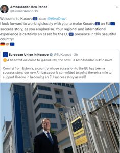 Ambasadori gjerman, Jorn Rohde, i ka dëshiruar mirëseardhje në detyrë ambasadorit të ri, shefit të zyrës së Bashkimit Evropian në Kosovë, Aivo Orav.