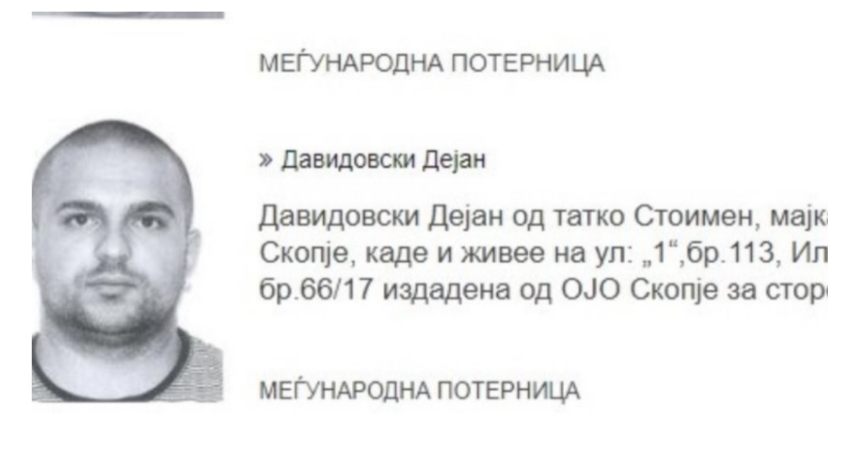 Dejan Davidovski – Desho kërkohej me fletarrest ndërkombëtar lëshuar nga Ministria e Punëve të Brendshme për sulmin në Kuvend më “27 prill” të vitit 2017. Dyshohet për bashkim kriminal dhe rrezikim të rendit kushtetues dhe sigurisë.