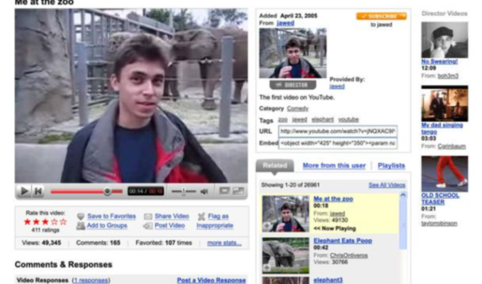 Videoja legjendare, e titulluar Me at the zoo, u publikua më 23 prill 2005 nga Jawed Karim, një nga bashkëthemeluesit e YouTube. Në klipin 19-sekondësh, Karim shfaqet para elefantëve në kopshtin zoologjik të San Diegos, duke realizuar një video me cilësi të ulët dhe kuadrim të thjeshtë, që sot konsiderohet pikënisja e revolucionit të përmbajtjes online. Aktualisht, videoja ka grumbulluar mbi 382 milionë shikime dhe më shumë se 18 milionë pëlqime.